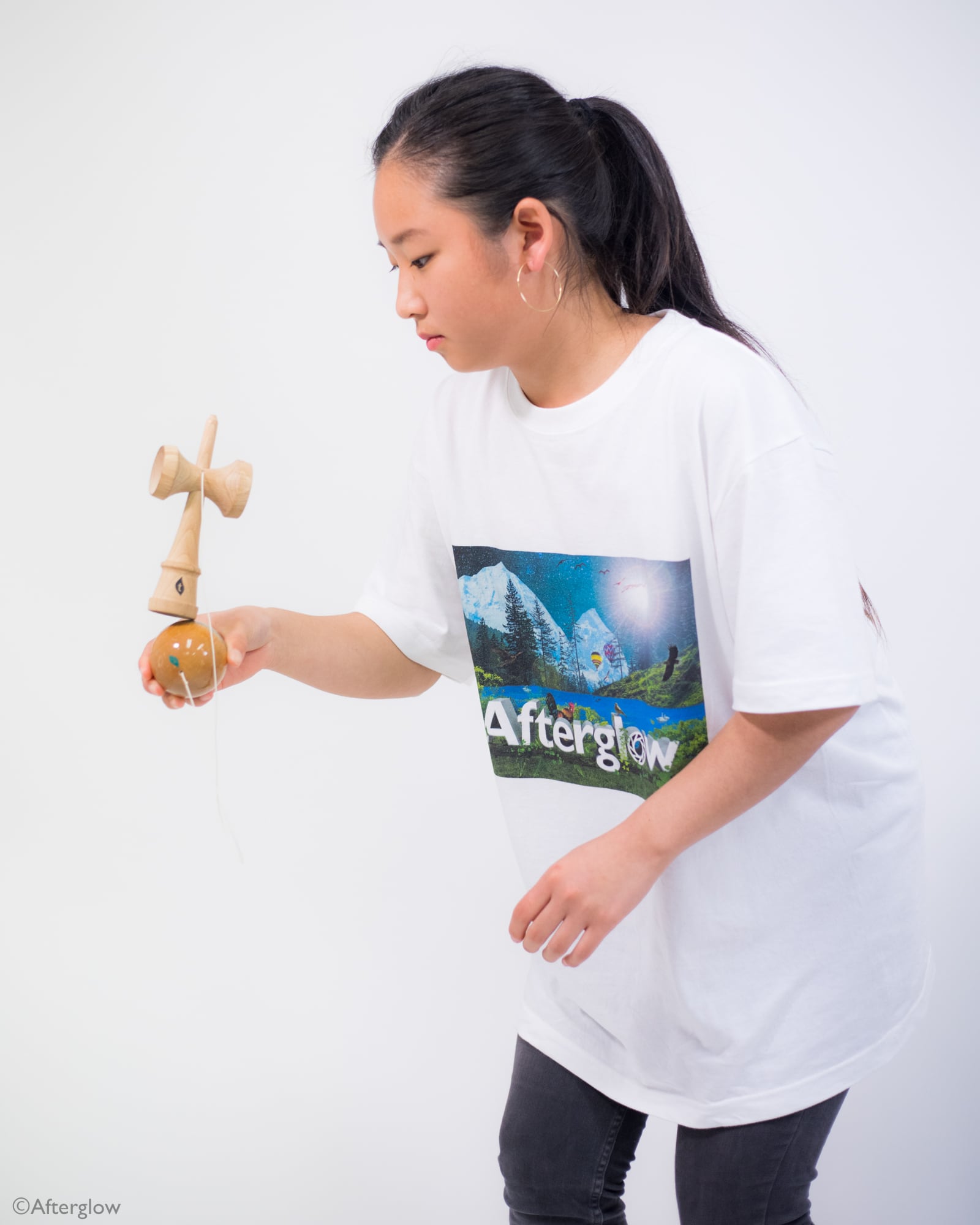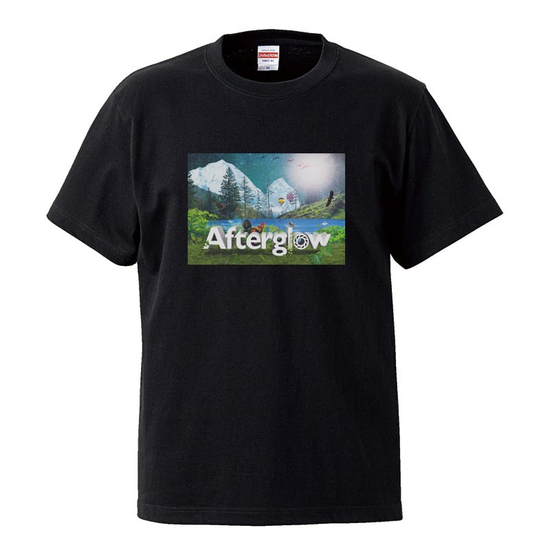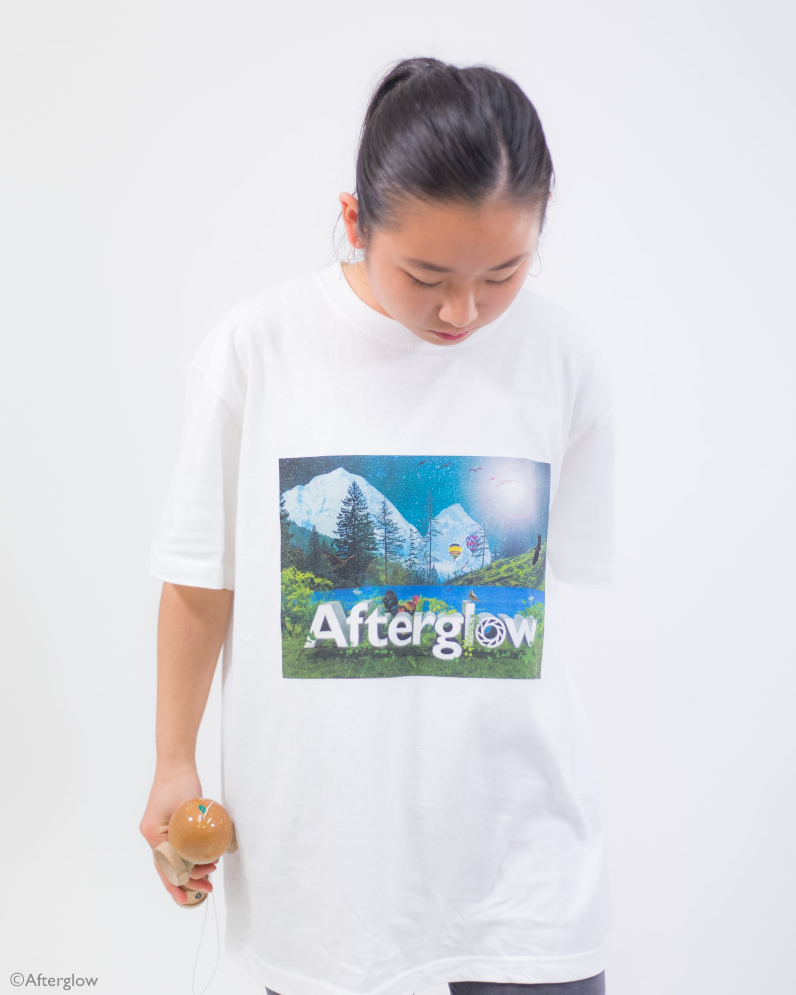 Afterglowのロゴのモチーフでもある山と太陽をイメージしてデザインしたコラージュ作品を胸中央にプリント